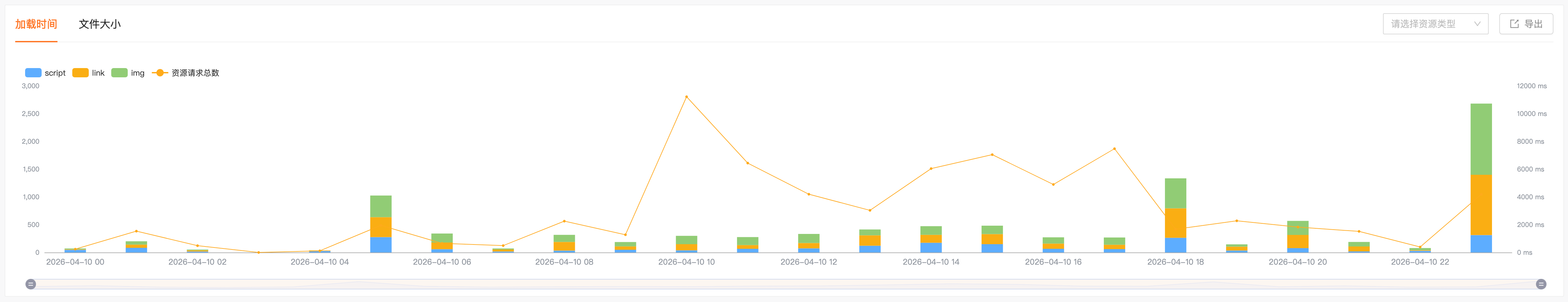当总览指标亮起红灯,我们需要迅速定位问题的时间窗口。trendChart(趋势图)组件提供了加载时间与文件大小的双 Tab 视图,配合资源类型筛选,是排查问题的利器。